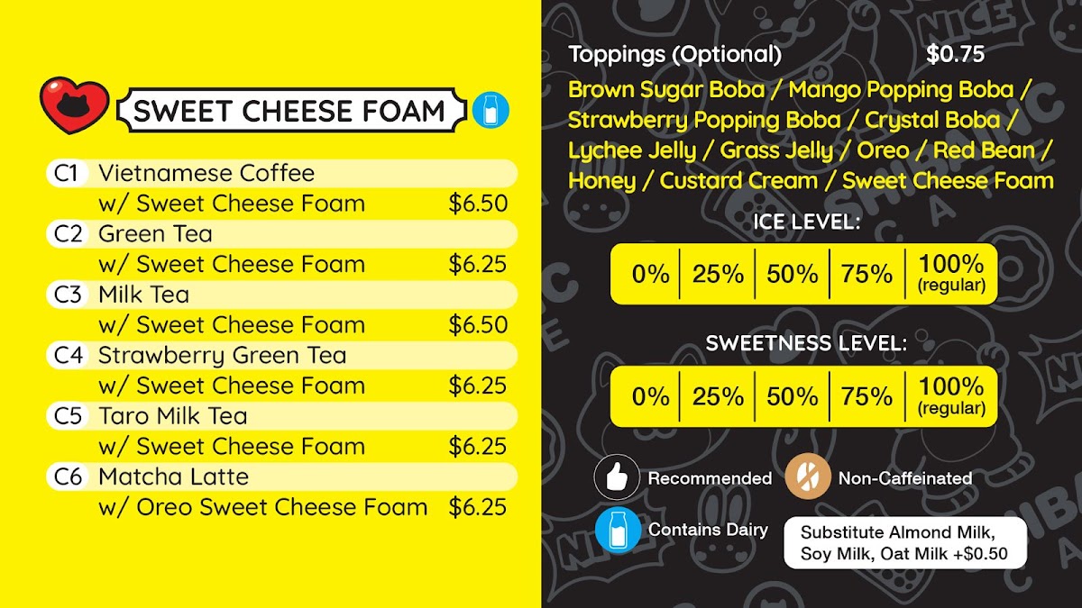 For milk tea lovers, the café shines with a variety of flavors from Boba Milk Tea to Oreo Milk Tea, with prices ranging from $5.75 to $6.25. Coffee enthusiasts can indulge in unique drinks such as the Vietnamese Iced Coffee or the inventive Oreo Matcha Latte. The playful, comic-style interior adds a lively twist to your experience.